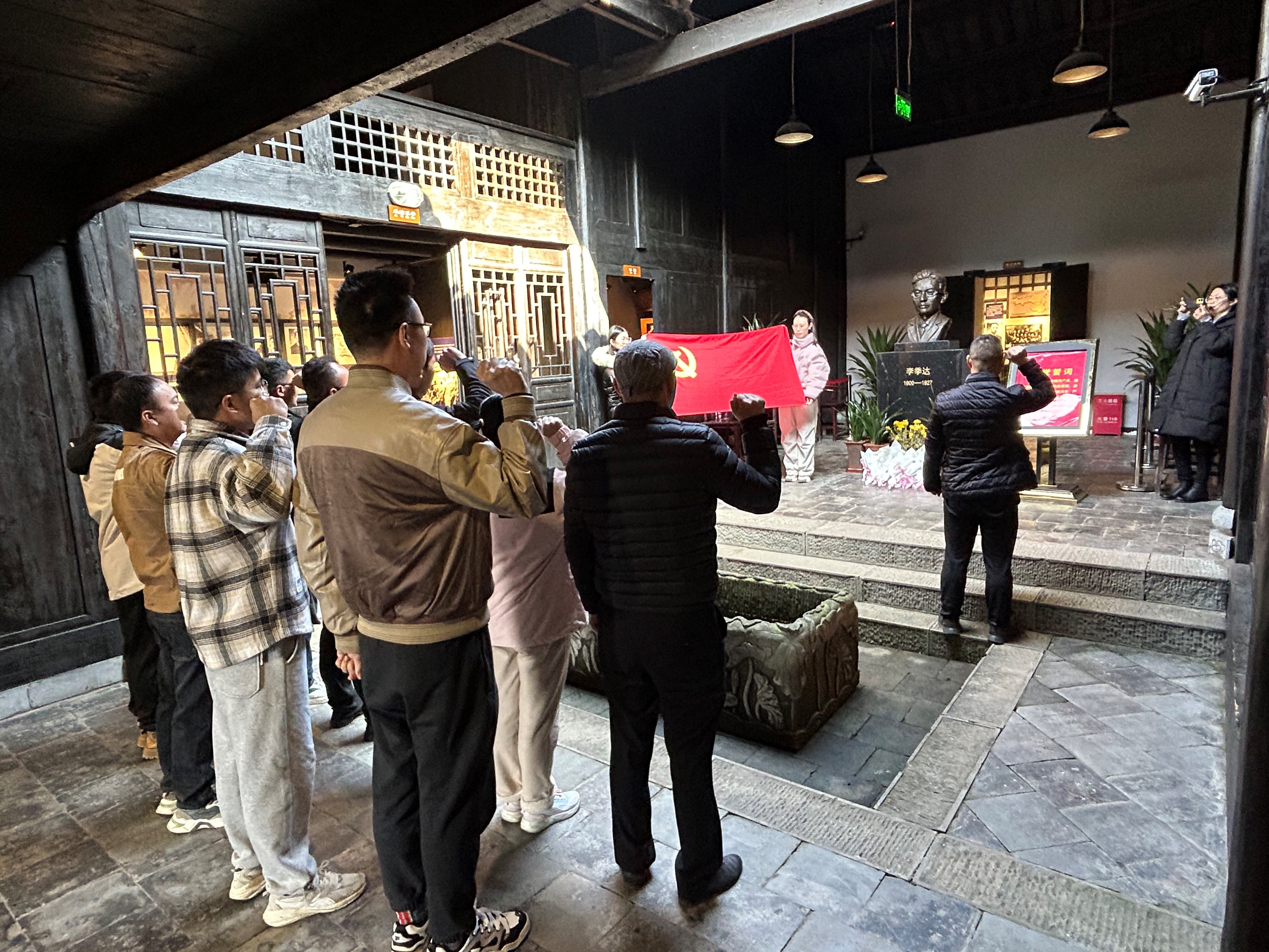 李季達是中國共產黨早期革命活動家,1900年出生于四川巫山,早年留學法俄,1924年加入中國共產黨,1925年任中共天津地方執行委員會書記,負責組織反帝愛國的工人群眾運動。1927年8月李季達被捕后不久英勇就義。大家在講解員的帶領下館內依次參觀了“少年壯懷”“赴渝求學”“留學法俄”“受任津門”“革命伉儷”“慷慨就義”六個展館,全面了解了李季達同志少年壯懷、矢志不渝、可歌可泣的革命經歷,深刻欽佩這位中共早期革命活動家短暫而光輝的一生。最后,全體黨員肅立在李季達同志塑像前,面向黨旗莊嚴宣誓,重溫了入黨誓詞。